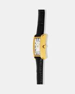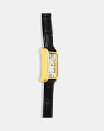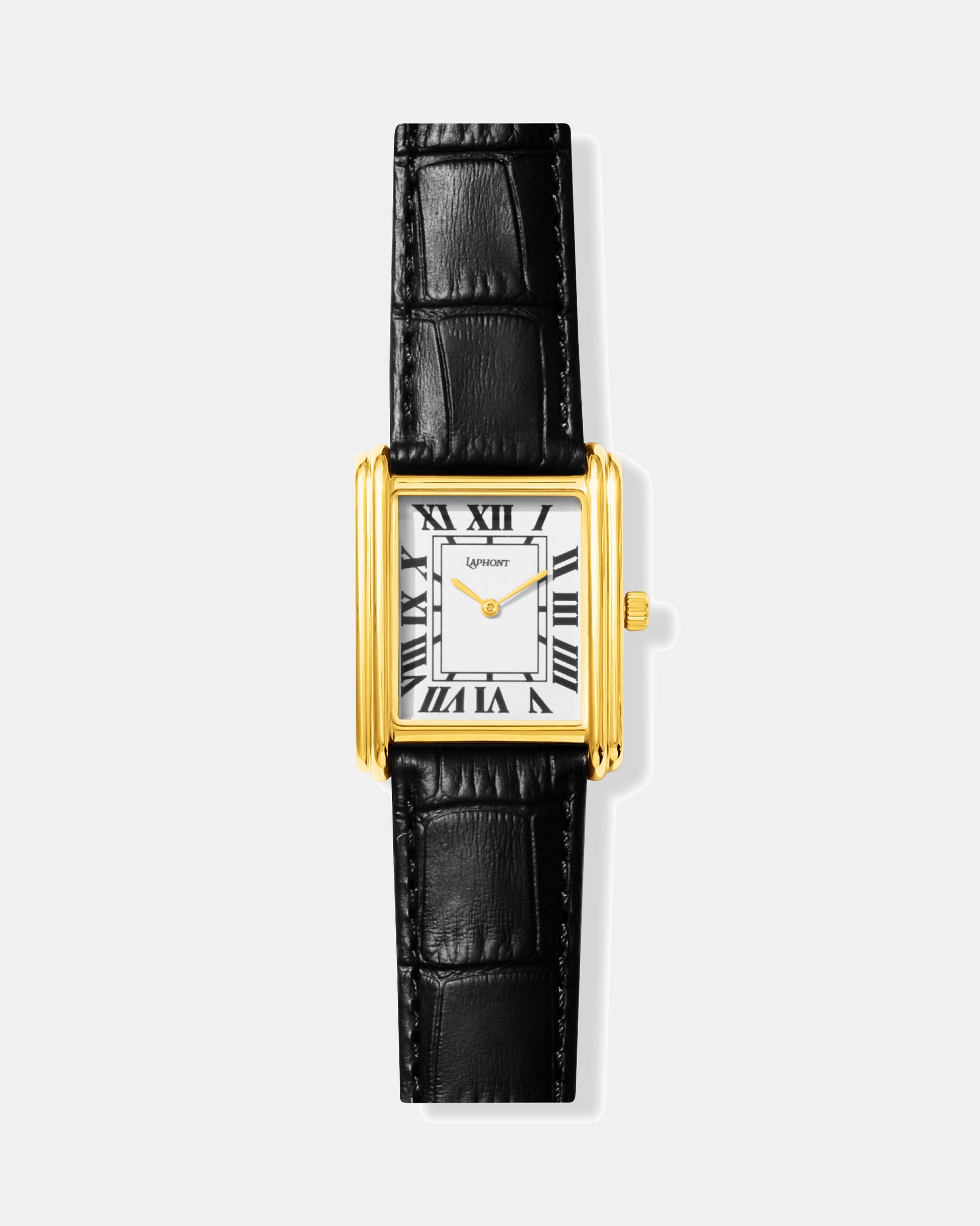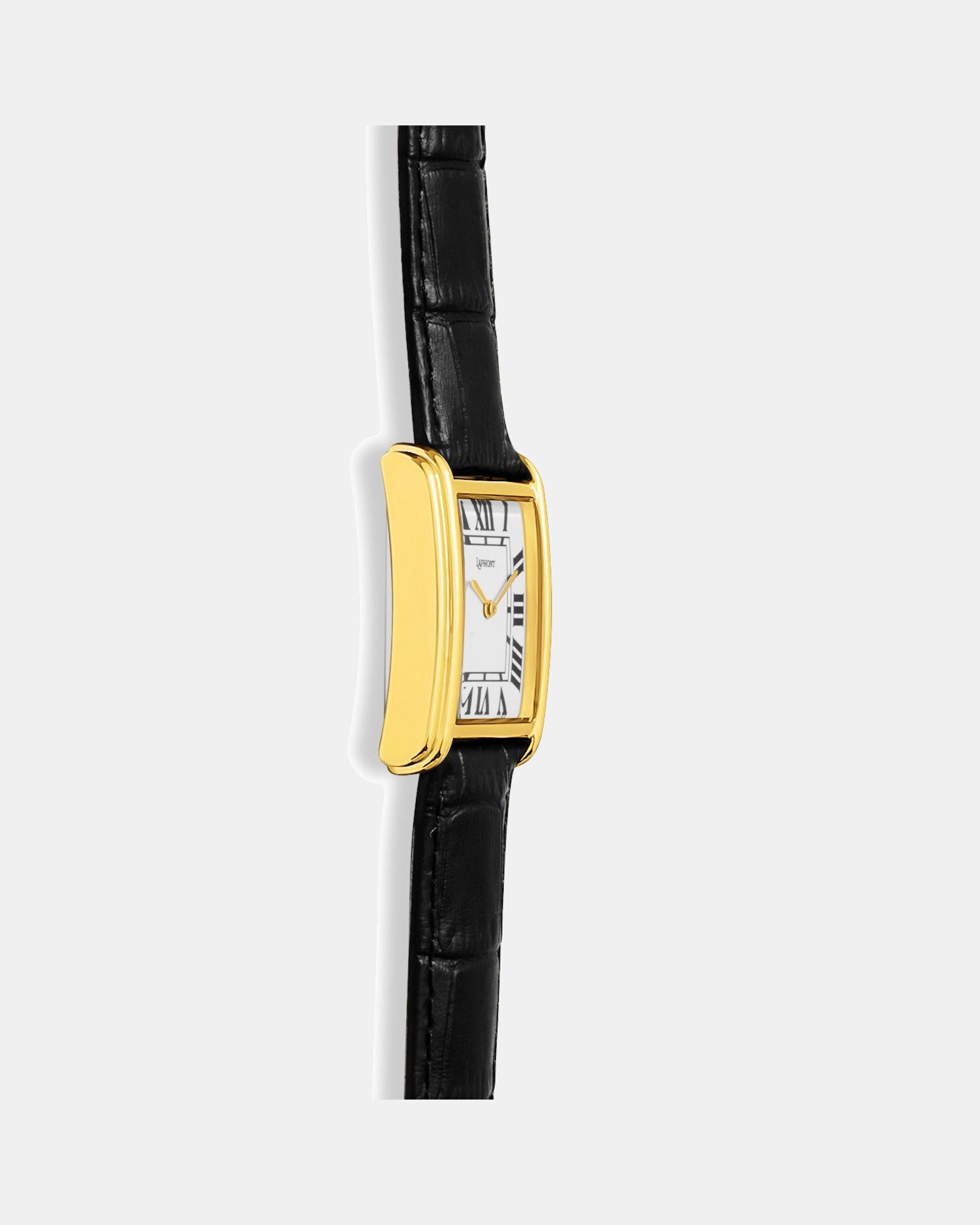 - Brutalism inspired stepped 14 Karat Gold Plated Stainless Steel Case