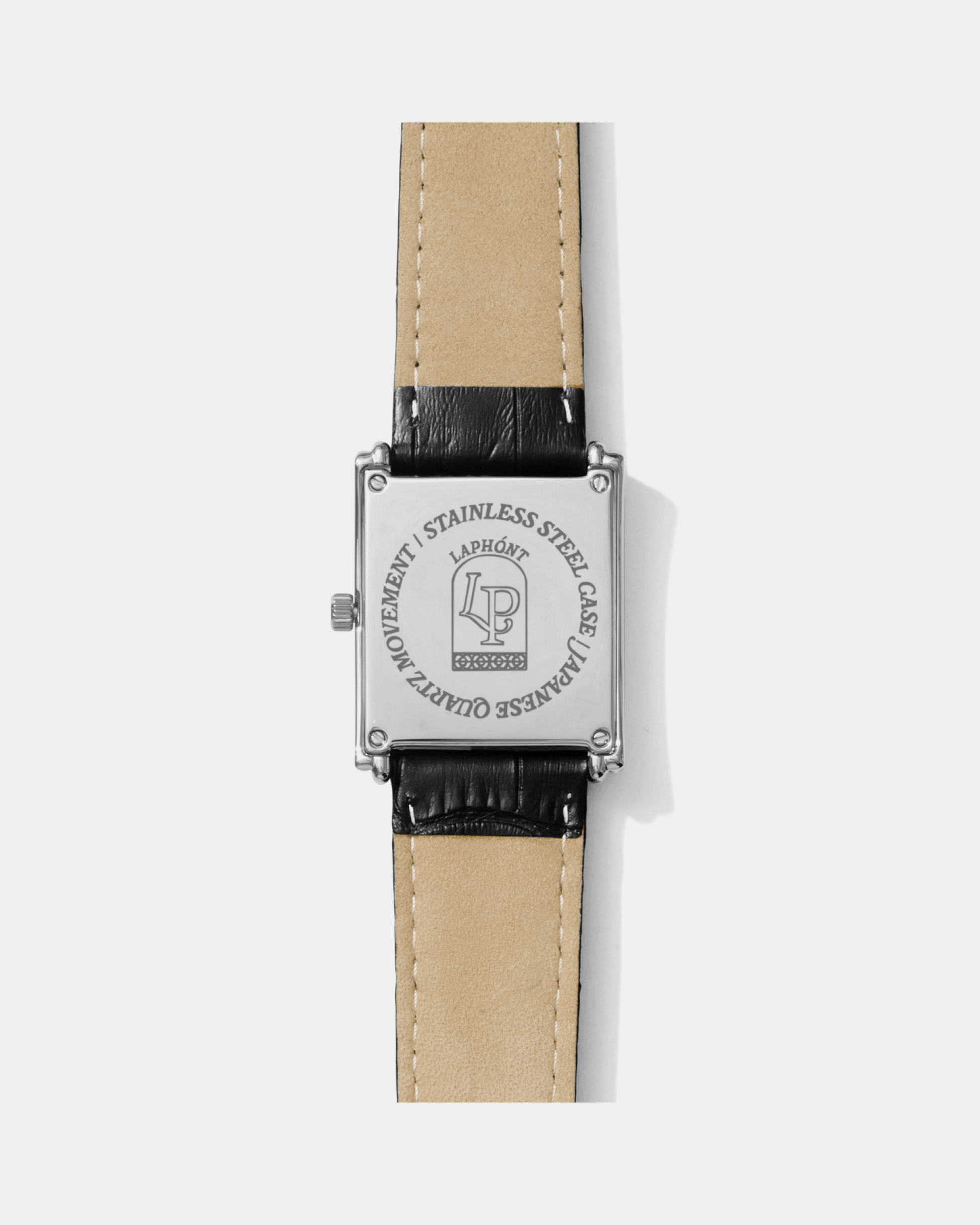 - Brutalism inspired stepped stainless steel case